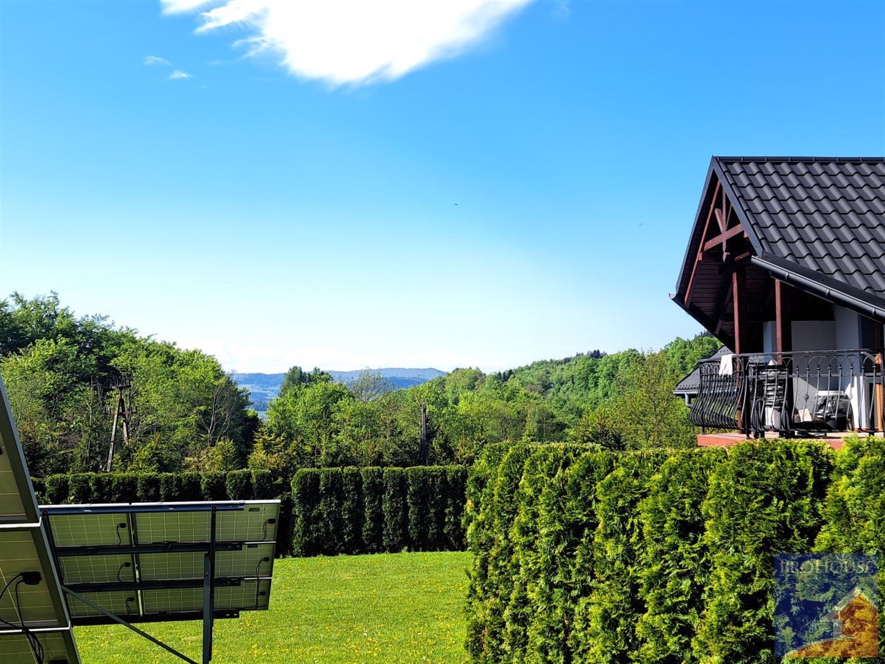 Dom z pompa ciepła posadowiony na dużej działce.