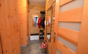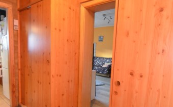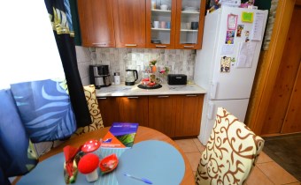 2) z lodówką, kuchenką gazową z piekarnikiem, okapem. Tutaj znajduje się również źródło ogrzewania i ciepłej wody użytkowej w postaci pieca gazowego. Cała podłoga oraz częściowo ściany wyłożone są płytkami, a pozostała powierzchnia ścian kamieniem naturalnym lub jest pomalowana farbą.