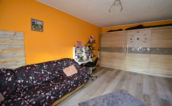2), w którym znajdziemy wyjście na balkon oraz dużą szafę w zabudowie. Jedna ze ścian wykończona jest kamieniem, który dodaje charakteru pomieszczeniu, a podłoga panelami.